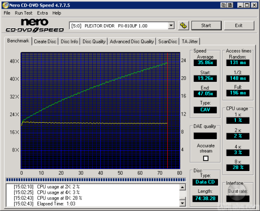 Plextor's new DVD writer gave us some mixed performance in our CD Winbench tests. While the PX-810UF's overall score wasn't as high as some of the other drives, its transfer rates were fairly good.It started reading at 20.4x (3065 / 150) and reached a maximum speed of about 42.9x (6430 / 150) on the outside.