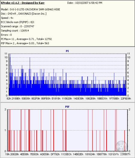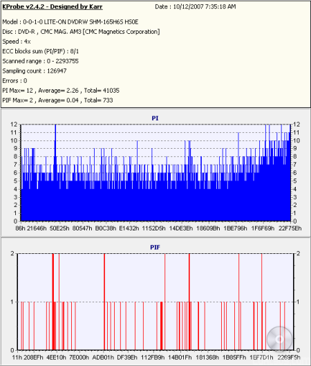 So what about writing quality? Testing a drive's DVD writing quality isn't easy. Until now, there were very few options, unless you wanted to shell out thousands of dollars for a certified test machine. Thanks to KProbe, we can test a disc's PI (Parity Inner) and PIF (Parity Inner Fail) rates.For these tests I used a Lite-On SHM-165H6S (firmware HS0E) and read the discs at 4x with the PI and PIF ECC sums set to 8 and 1 respectively. For comparison, I also tested the discs on a BenQ DW1640 (firmware BSLB). When combined with Nero CD Speed, the DW1640 is able to report PI Errors, PI Failures, Parity Outer Failures and even jitter levels. For this test, the discs are read at 8x with both the PI and PIF ECC sums set to 8.