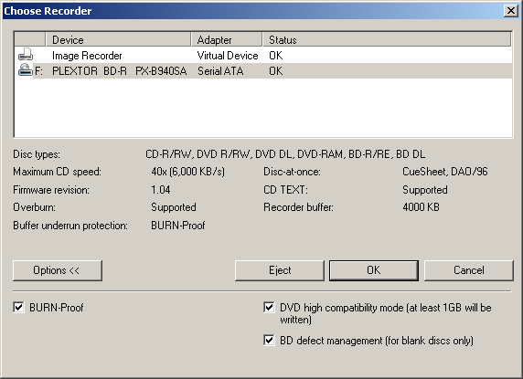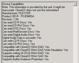 Here is a screen shot from Erik Deppe's Opti Drive Control. Among other things, this program queries the drive to see what its reading and writing capabilities are. Opti Drive Control had no problems detecting the PX-B940SA's reading and writing speeds and supported disc types.