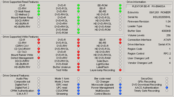 While Opti Drive Control gives us a quick glance at the PX-B940SA's features, DVDINFOpro provides a little more information on some of the drive's reading and writing capabilities. By looking at the screenshot above you can see that Plextor's new drive can read and write to most BD and DVD formats.