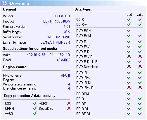 Opti Drive Control also shows that the PX-B940SA is an RPC-2 DVD drive. This means that the drive's region is stored in the firmware. The region can be changed five times and after that it cannot be changed anymore. Unfortunately, a patched RPC-1 firmware is not yet available for this drive.