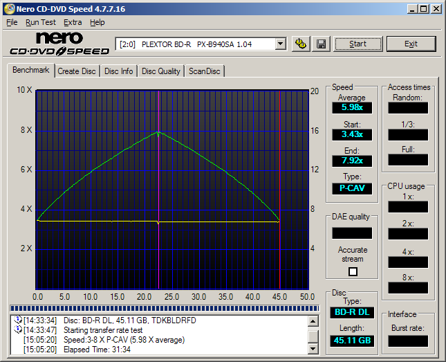 The PX-B940SA performed reasonably well when reading single layer BD-ROM discs. In our tests, the drive started reading at 3.33x and reached a maximum transfer speed of 7.94x.