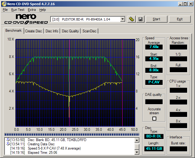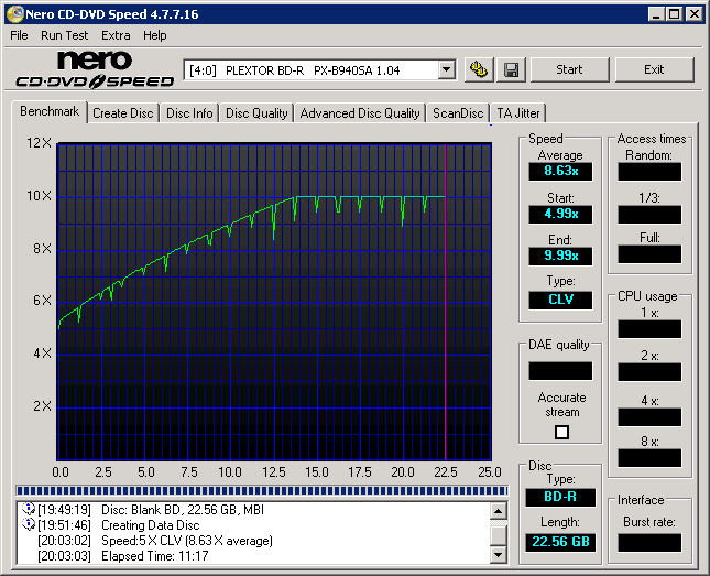 The PX-B940SA is the first drive from Plextor that can write to both BD-R and BD-R DL media at 12x. Looking at the screenshot above, you can see that the drive uses CAV when writing to BD-R discs at this speed.