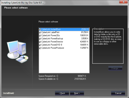 After selecting your preferred language and entering your customer information, you'll be presented with a number of installation options. From here, you can choose to install InstantBurn, LabelPrint, Power2Go, PowerBackup, PowerDirector, PowerDVD or PowerProducer. Simply select the components you want and click next a few times. Once the files are copied over, you can start burning your own discs.