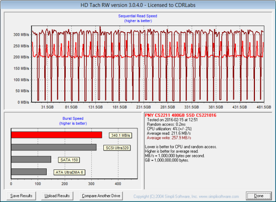 The CS2211 performed very well when benchmarked with HD Tune. The drive had average read and write speeds of 499.3 MB/s and 486.7 MB/s, respectively, and a burst rate of 146.1 MB/s when reading.