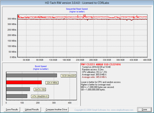 Looking at the screenshot above, you can see that the CS2211 had average read and write speeds of 365.8 MB/s and 345.6 MB/s respectively, as well as a burst speed of 224.4 MB/s.