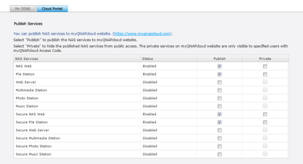 When it's done, you can go into the Cloud Portal and select which services you want published to the myQNAPcloud website. You can also hide services from public access by setting an access code and specifying the users who are allowed to view them.