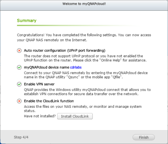 Once you've registered your device, the wizard will try to configure your router. If the router supports UPnP, the relevant ports are automatically opened for you. As you can see in the summary, my router does not support UPnP port forwarding so I had to go in manually and open them up. If opening the ports manually isn't an option either, the TS-453mini's CloudLink service can still grant you access.