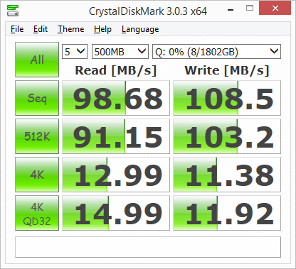 First, I ran a few quick tests using CrystalDiskMark. This benchmark tool measures the performance of a storage device by testing its sequential read and write speeds as well as its random read and write speeds using blocks 4KB and 512KB in size.