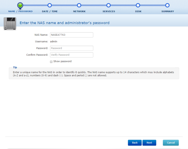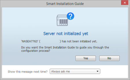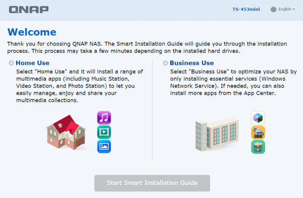 If your device is not configured, Qfinder will give you the option to launch the smart installation guide. To begin, you will need to select whether it will be used for home or business use. This will determine which apps are installed by default. From here, you can change the name of the NAS, enter an admin password, change the date and time, configure the network and select your disk configuration.