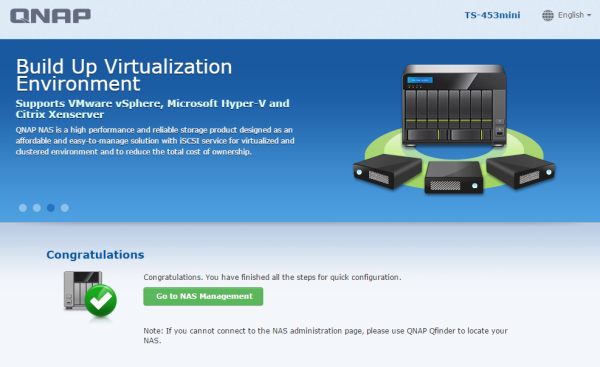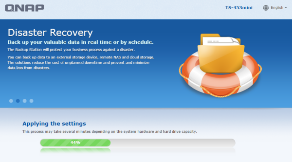 With the hard drives installed, you can now connect the network cable and power cord and turn the TS-453mini on. The server will beep once and then after another 2-3 minutes it will beep again, indicating that it has started up successfully.