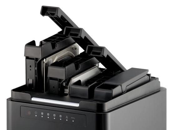 Let's face it, 4-bay NAS devices are a dime a dozen these days. Every time you turn around, some company has announced a new and improved model with a faster processor and even more expansion ports. What they all seem have in common, though, is that they're big, blocky and not very pleasant to look at. Needless to say, this isn't the case with the QNAP TS-453mini. By moving the drive bays from the front to the top, QNAP's new device takes up less desktop space than most other 4-bay NAS servers. Also, with its piano black finish, whisper quiet heat exhaust and skyline LED, the TS-453mini is just as much at home in the living room as it is in the office.