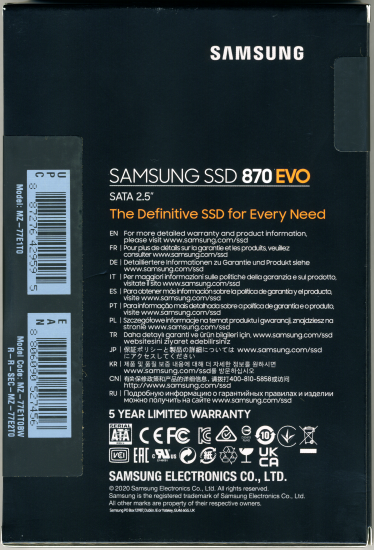 The 870 EVO comes in a small black box. Along with a picture of the drive, the packaging advertises a number of its key features including its 1TB capacity, rated read and write speeds, and 5 year warranty. Inside, you'll find the SSD as well as a small installation guide and warranty statement.