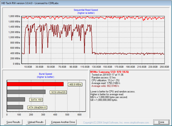 Next, I used HD Tach to test the 970 EVO Plus's read, write and burst speeds as well as its seek times and CPU usage.
