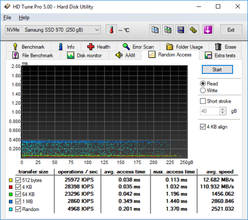 Next, I ran a series of tests using HD Tune Pro. This hard disk utility measures a drive's performance by testing its sequential read and write speeds as well as its access time, burst rate and CPU usage. For this review, I'm also going to use it to benchmark the 970 EVO Plus's random read and write speeds, random access times and the number of operations per second.