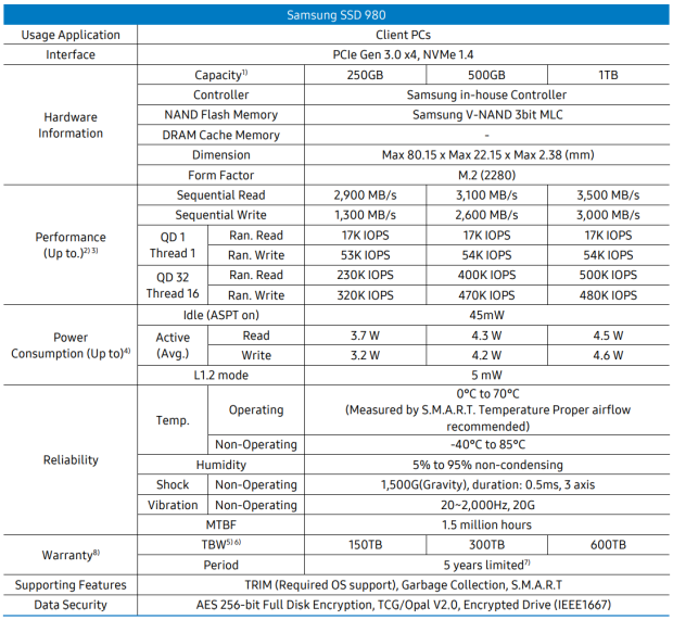 The 980 is available in 250GB, 500GB and 1TB capacities. For this review, Samsung sent us the 1TB version of the drive, which is capable of delivering up to 3,500 MB/s sequential read and 3,000 MB/s sequential write speeds as well as up to 500K random read and 480K random write IOPS.