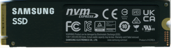 For the 2TB version of the 980 PRO, Samsung has used their own 1xx-layer, 3-bit MLC V-NAND flash chips. Looking at the pictures above, you can see that there are two 1TB NAND flash packages on the top of the PCB. The drive also has a single 2GB LPDDR4 DRAM memory chip that is used for caching.