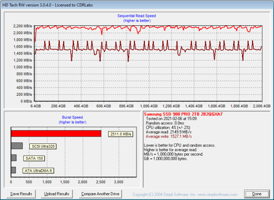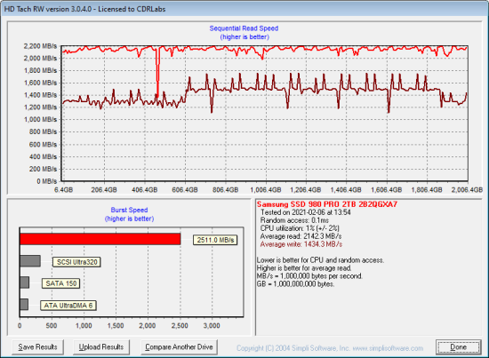 Next, I used HD Tach to test the 980 PRO's read, write and burst speeds as well as its random access time and CPU usage.