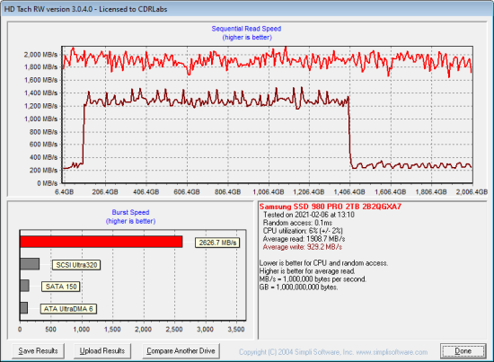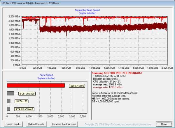 Looking at the screenshot above, you can see that the 980 PRO had average read and write speeds of 2160.9 MB/s and 1738.6 MB/s respectively, as well as a burst speed of 2658.7 MB/s. The screenshot also shows the transition from TurboWrite to what Samsung calls "After TurboWrite" speeds. The 980 PRO starts writing at about 2000 MB/s and then drops to about 1600 MB/s when the consecutive write operation exceeds the size of the SLC buffer.