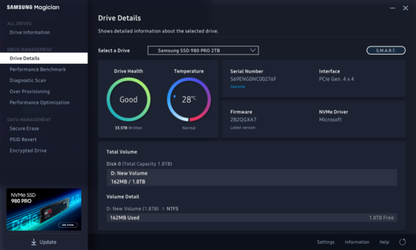 The Samsung Magician software is designed to help users easily monitor the health and maximize the performance of their Samsung SSD. From the main screen, users can check the condition of their drives and view information like the temperature, total and available capacities and the total bytes written.