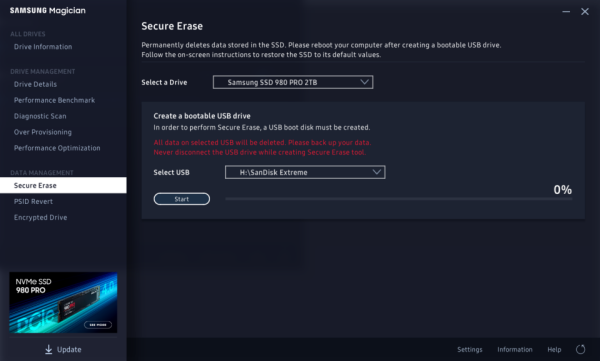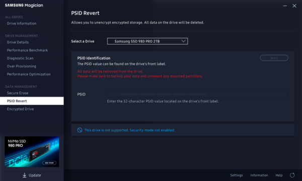 Samsung's Magician software also includes a number of data management features. Along with the ability to permanently delete sensitive data, it can unlock and reset your drive to its factory setting by entering the 32-character PSID password printed on the drive label. Last, but not least, Magician gives you the ability to activate Encrypted Drive to protect private and sensitive data. The software lets you review your drive’s current security settings and helps you with the setup process.