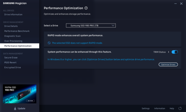 Magician also gives users the ability to optimize the performance and lifespan of their SSD by setting aside extra free space. In addition, users can improve the performance of their drive by forcing TRIM to run.