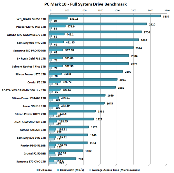 PCMark 10's Full System Drive Benchmark uses a wide-ranging set of real-world traces from popular applications and common tasks to fully test the performance of the fastest modern drives. This benchmark produces an overall score as a measure of drive performance. Comparing devices is as simple as comparing scores. The tests also measure and report the bandwidth and average access time performance for the drive.