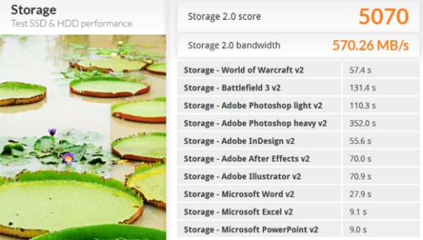 PCMark 8 is a complete benchmark for Windows. It includes five benchmark tests, each designed around a specific scenario. The storage benchmark measures drive performance using real-world traces recorded from Adobe Creative Suite, Microsoft Office and a selection of popular games.