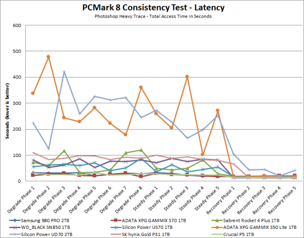 PCMark 8 also includes a consistency test which measures the performance consistency and degradation tendency of a storage system. The test reports the performance level at the start, the degraded steady-state and the recovered state as well as the number of iterations required to reach the degraded state and the recovered state. For this test, we are focusing on the Adobe Photoshop (Heavy) trace and will look at both the bandwidth and latency of the drive
