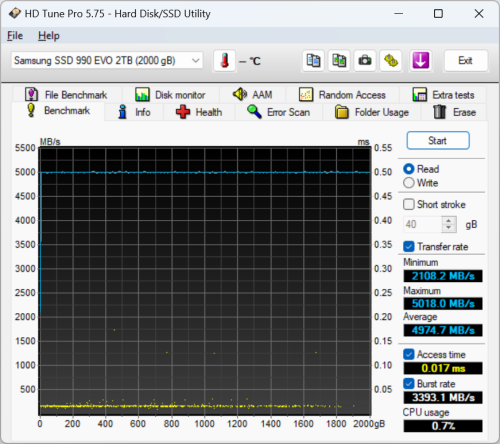 The 990 EVO performed relatively well when benchmarked with HD Tune. The drive had average read and write speeds of 4974.7 MB/s and 1535.5 MB/s, respectively.