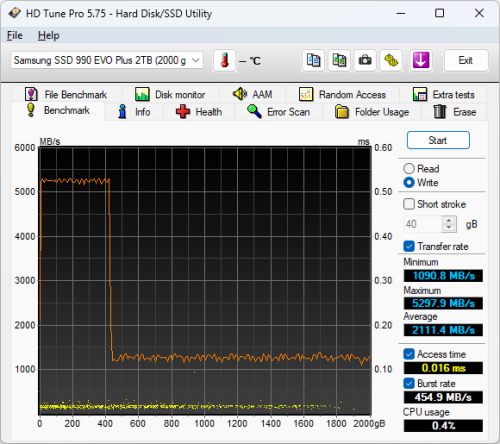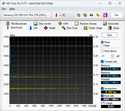 The 990 EVO Plus performed fairly well when benchmarked with HD Tune. The drive had average read and write speeds of 6080.3 MB/s and 2111.4 MB/s, respectively.