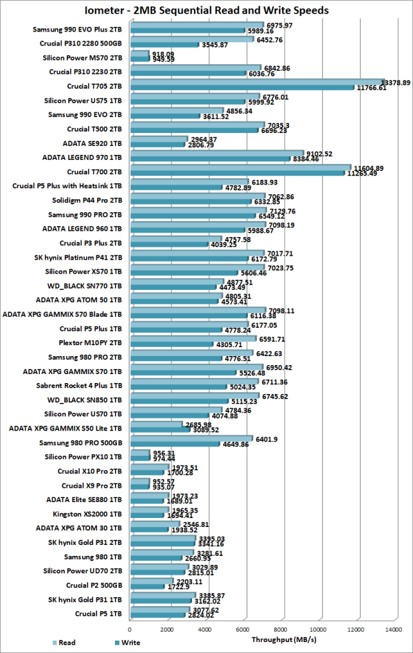 To test the performance of Samsung's 990 EVO Plus SSD, I ran a series of benchmarks using CrystalDiskMark, ATTO Disk Benchmark, AS SSD, HD Tune Pro, Anvil's Storage Utilities, Iometer and PCMark. For comparison, I've also included test results from the Crucial P310 2280, Silicon Power MS70, Crucial P310 2230, Crucial T705, Silicon Power US75, Samsung 990 EVO, Silicon Power PX10, Crucial T500, ADATA SE920, ADATA LEGEND 970, Crucial T700, Solidigm P44 Pro, Samsung 990 PRO, ADATA LEGEND 960, Crucial P3 Plus, SK hynix Platinum P41, Silicon Power XS70, WD_BLACK SN770, ADATA XPG ATOM 50, ADATA XPG GAMMIX S70 Blade, Crucial P5 Plus, Plextor M10PY, ADATA XPG GAMMIX S70, Sabrent Rocket 4 Plus, WD_BLACK SN850, Silicon Power US70, ADATA XPG GAMMIX S50 Lite, Crucial X10 Pro, Crucial X9 Pro, ADATA Elite SE880, Kingston XS2000, ADATA XPG ATOM 30, Samsung 980, Silicon-Power UD70, Crucial P2, SK hynix Gold P31 and Crucial P5.