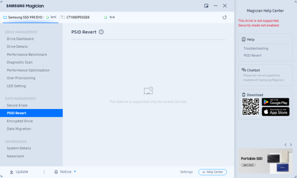 Samsung's Magician software also includes a number of data management features. Along with the ability to permanently delete sensitive data, it can unlock and reset your drive to its factory setting by entering the 32-character PSID password printed on the drive label. In addition, Magician gives you the ability to activate Encrypted Drive to protect private and sensitive data. The software lets you review your drive’s current security settings and helps you with the setup process.