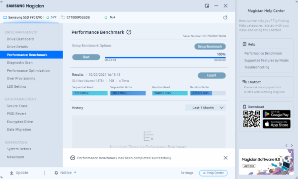 Samsung's Magician software can also be used to benchmark the performance of a storage device. Looking at the screenshot below, you can see that it tests the sequential and random read and write performance of a drive. Users can also compare these scores with past results to maintain the highest performance possible.