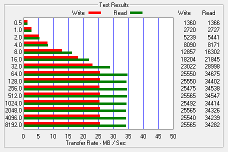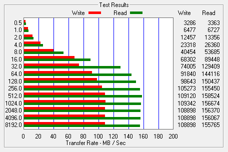 I also used ATTO Disk Benchmark to test the Bar's sequential read and write speeds. The test was run using blocks ranging in size from 0.5KB to 8192KB and the total length set to 256MB.