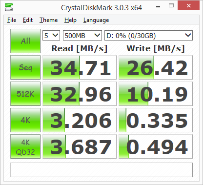 First, I ran a few quick tests using CrystalDiskMark. This benchmark tool measures the performance of a storage device by testing its sequential read and write speeds as well as its random read and write speeds using blocks 512K and 4K in size.