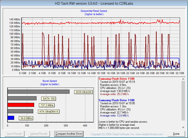The Bar didn't perform quite as well when tested with HD Tach. Looking at the screenshot above, you can see that the drive had average read and write speeds of 130.0 MB/s and 25.2 MB/s, respectively, as well as a burst speed of 137.3 MB/s.