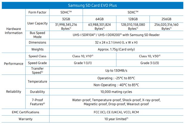 The EVO Plus has also been designed with maximum durability in mind and features Samsung's seven-proof protection. In addition to protection from water, temperature, x-rays, magnets and shocks, this new SD card is drop and wear-out proof and can withstand up to a five-meter drop as well as up to 10,000 swipes. To top it all off, the EVO Plus comes with a 10-year limited warranty.
