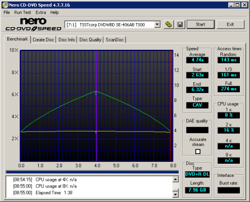 The SE-406A didn't slow down very much when reading single layer DVD videos. It started out at about 3.38x and reached a maximum read speed of 8.18x. Samsung's new drive was also relatively quick when reading dual layer discs. By looking at the screenshot below, you can see that the drive's transfer speeds peaked at about 6x.