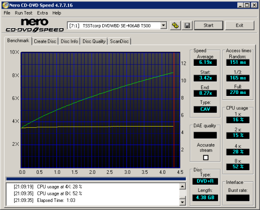 The SE-406A uses P-CAV, or Partial CAV, when writing to DVD+R and DVD-R media at 8x. By looking at the screenshots above, you can see that Samsung's new drive starts writing at 3.46x and accelerates, reaching its maximum speed at about the 4.1GB minute mark.