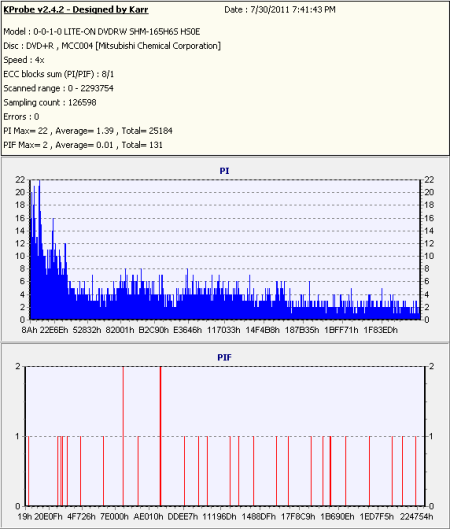 So what about writing quality? Thanks to KProbe, we can test a disc's PI (Parity Inner) and PIF (Parity Inner Fail) rates. For these tests I used a Lite-On SHM-165H6S (firmware HS0E) and read the discs at 4x with the PI and PIF ECC sums set to 8 and 1 respectively. For comparison, I also tested the discs on a BenQ DW1640. When combined with Nero CD Speed, the DW1640 is able to report PI Errors, PI Failures, Parity Outer Failures and even jitter levels. For this test, the discs are read at 8x with both the PI and PIF ECC sums set to 8.
