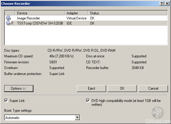 Nero shows that the SH-S203B has a maximum CD writing speed of 48x and a 2048KB buffer, which is backed up by MediaTek's Super Link technology. According to Nero, Samsung's new DVD writer can also write CD-Text and overburn. When testing the drive's capacity, it had no problems overburning up to 99 minutes with our CompUSA media.