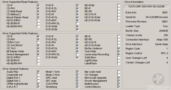 InfoTool also shows that the SH-S203B is an RPC-2 DVD drive. This means that the drive's region is stored in the firmware. The region can be changed five times and after that it cannot be changed anymore. Unfortunately, a patched RPC-1 firmware is not yet available for this drive.