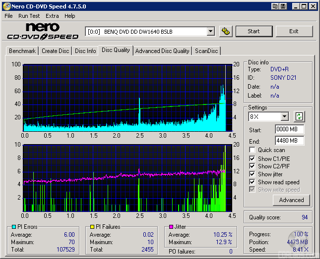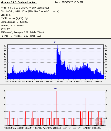 So what are "good" results supposed to look like? With KProbe, the PI errors should not exceed 280 and the number of PIF errors should stay below 4. When testing with CD Speed, the number of PI errors should stay below 280 as well. However, because it scans with an ECC sum of 8, a higher number of PIF errors is acceptable, as long as they do not exceed 32. Since POF errors are uncorrectable, we really don't want to see any of them at all.
