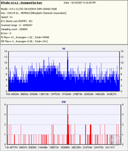 So what about writing quality? Testing a drive's DVD writing quality isn't easy. Until now, there were very few options, unless you wanted to shell out thousands of dollars for a certified test machine. Thanks to KProbe, we can test a disc's PI (Parity Inner) and PIF (Parity Inner Fail) rates.For these tests I used a Lite-On SHM-165H6S (firmware HS0E) and read the discs at 4x with the PI and PIF ECC sums set to 8 and 1 respectively. For comparison, I also tested the discs on a BenQ DW1640 (firmware BSLB). When combined with Nero CD Speed, the DW1640 is able to report PI Errors, PI Failures, Parity Outer Failures and even jitter levels. For this test, the discs are read at 8x with both the PI and PIF ECC sums set to 8.