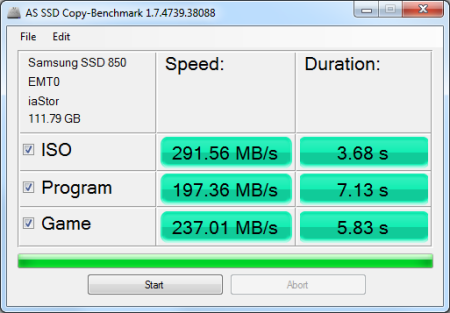 AS SSD also includes a copy benchmark. This test copies an ISO (two large files), program (many small files) and game (small and large files), returning the speed and duration of each.