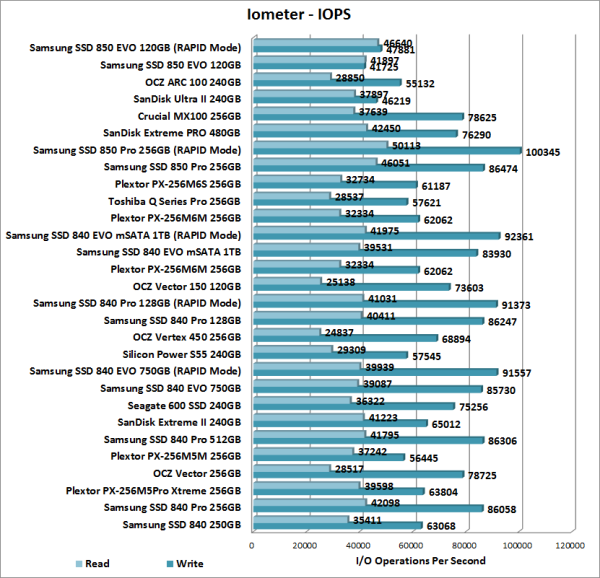 According to Samsung, the 120GB 850 EVO is capable of 94,000 IOPS when reading and 88,000 IOPS when writing 4K blocks. In our tests, the drive reached 41,897 random read IOPS and 41,725 random write IOPS. With RAPID mode enabled, we saw a slight performance boost. This time around, the drive reached 46,640 random read IOPS and 47,881 random write IOPS.
