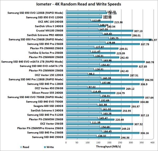 The 850 EVO's random read and write performance was a mixed bag. While the drive was able to read at a respectable 163.66 MB/s, its random write speed topped out at only 162.99 MB/s. With RAPID mode enabled, its random write speed jumped to 187.03 MB/s. However, it still lagged behind similarly priced drives like the OCZ ARC 100 and Crucial MX100.