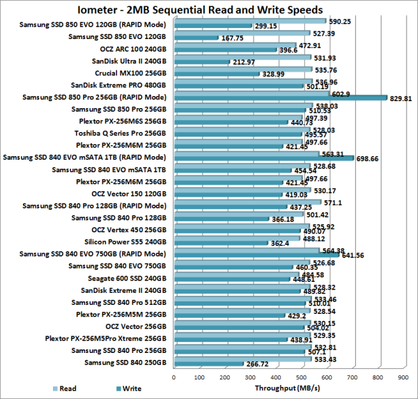 The EVO 850's performance was hit and miss when tested with Iometer. While the drive was able to read at a respectable 527.39 MB/s, its sequential write speed averaged out at only 167.75 MB/s. With RAPID mode enabled, its read and write speeds jumped to 590.25 MB/s and 299.15 MB/s, respectively.