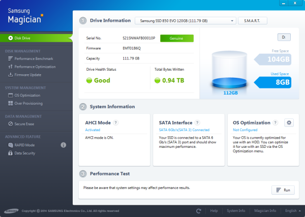 The Samsung Magician software is designed to help users easily manage the health and performance of their Samsung SSD. From the main screen, users can check the health of their drives and view information like the serial number, firmware, capacity and the total bytes written. This screen also shows whether or not AHCI mode has been activated as well as the speed of the SATA interface.